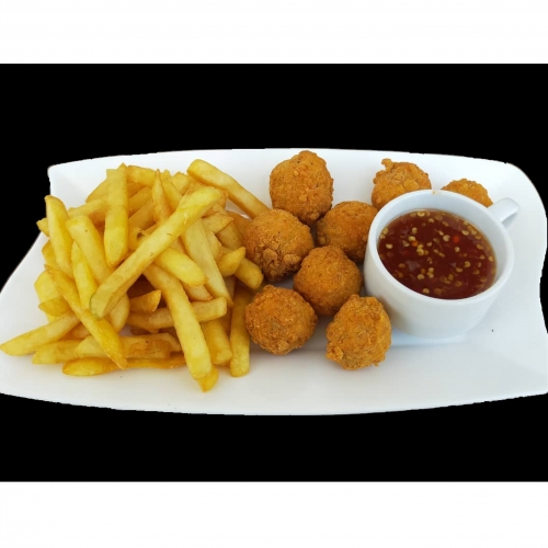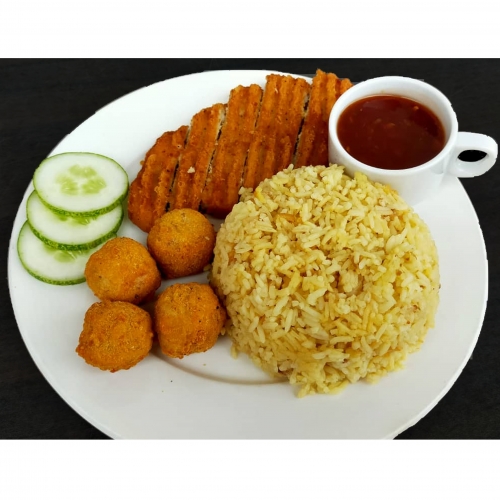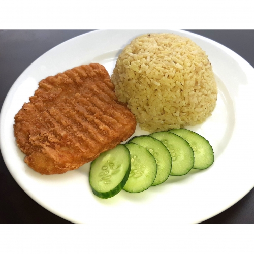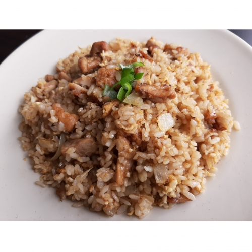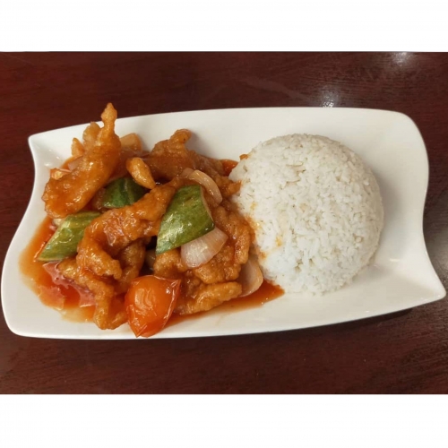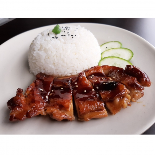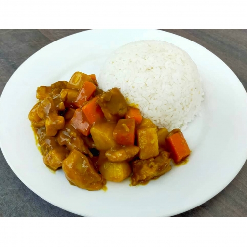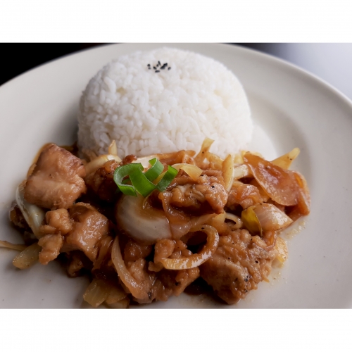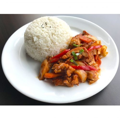 Stir-fried diced chicken marinated in a gochujang-based sauce with many pices and served with rice.